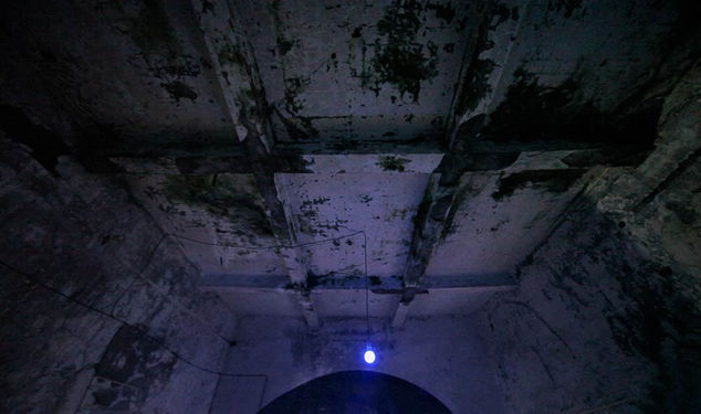 As water starts dripping, piles of salt gathered on the ground are slowly shaped. This delicate cycle is accentuated by blue light, which resembles an artificial atmosphere highlighting the interplay of circular patterns found in nature with the industrial forms of the building.